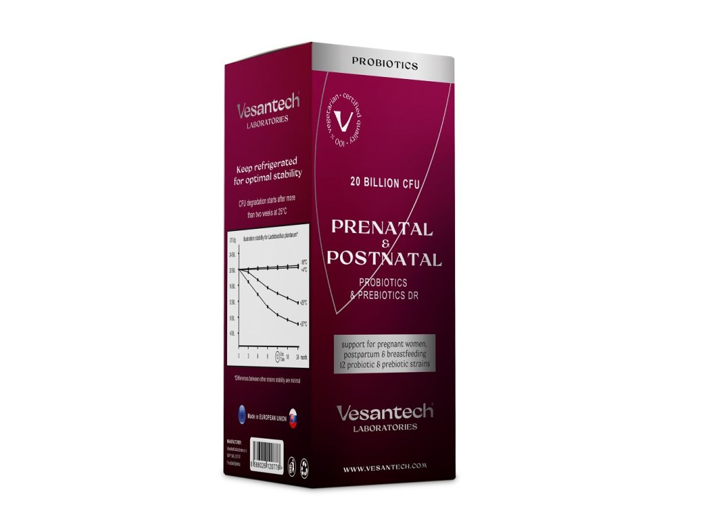 Vesantech Prenatal & Postnatal Probiotics DR je prémiový probiotický komplex vyvinutý špeciálne pre potreby žien počas tehotenstva, po pôrode a v období dojčenia. Bezpečné pre plod, dojča a matku.